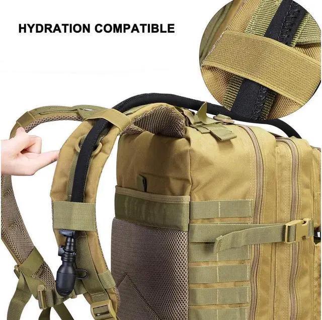 ERGONOMIC: come with a flag, there is a place for any patch. The assault backpack also has hydration compatible which can hold a 2.5L/3L bladder, the strap has an elastic band as a holder to secure the bladder hose.