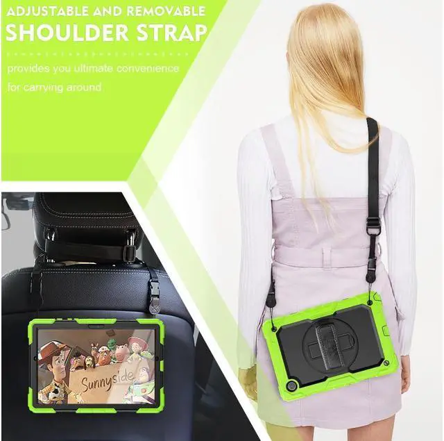 HAND STRAP & SHOULDER STRAP --- Adjustable and rotating hand strap provide easy grip and comfortable hold when you're using the tablet. Adjustable shoulder strap are great for entertaining on car trip, plane ride even outdoor activities. You can carry the tablet around to wherever or hung it on the car headrest for back-seat passengers' entertainment.