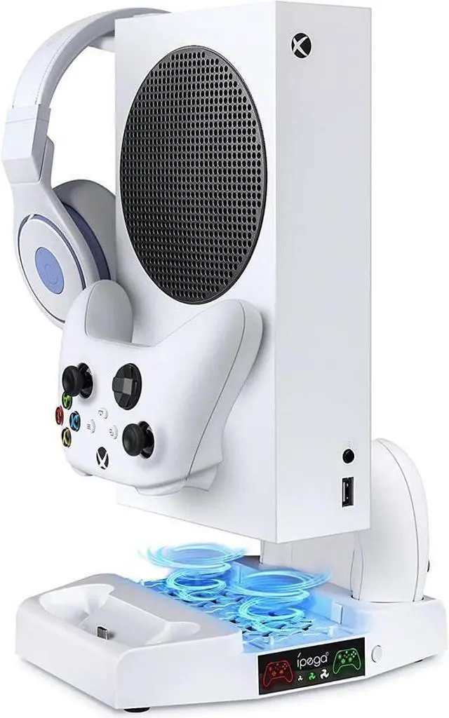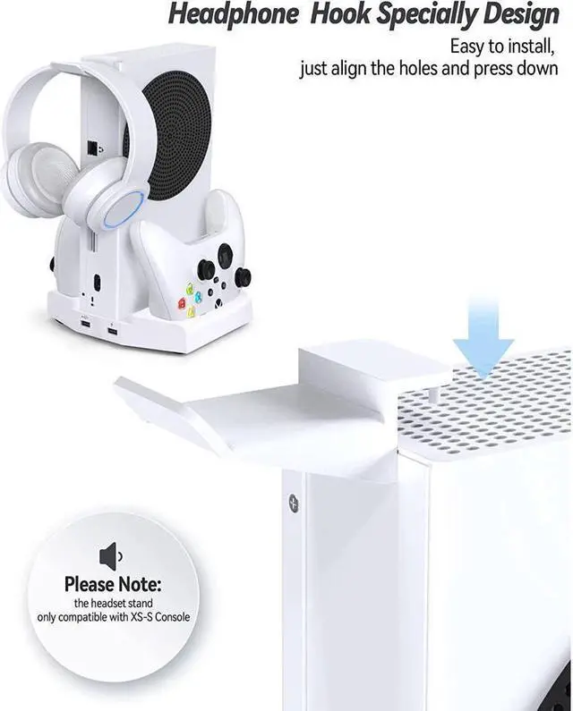 Keep Desktop Tidy --- The cooling stand is compatible with Xbox Series S console and two controllers,there is a stand for hanging gaming headsets to help you better organize your desktop, save space and keep it tidy.(Please note: The package does not include the console,headset and controllers.)
