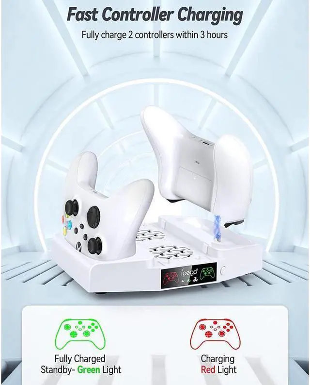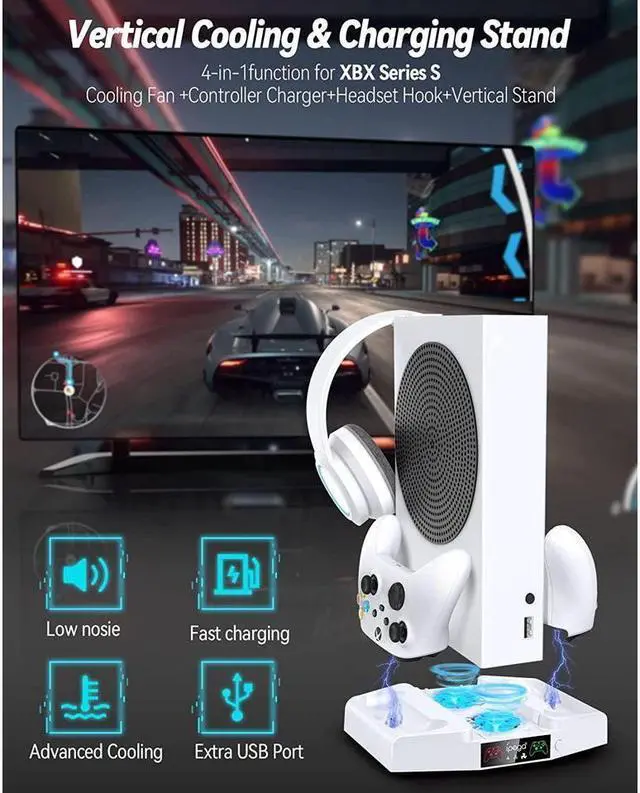 Compatible with Xbox Series S Essential Accessories --- This cooling stand is designed specifically for the Xbox Series S. No longer have to worry about long game time will make the console hot, for the console of cooling, controller charging, game console storage are provided with the perfect solution.