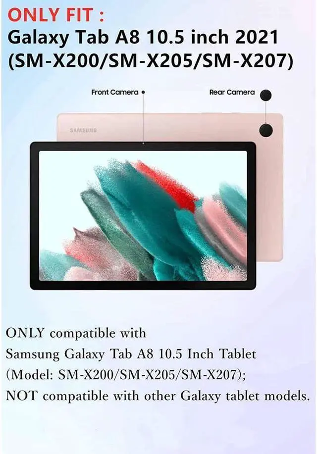 Compatibility: Only Fit for Samsung Galaxy Tab A8 10.5 inch 2022 (Model: SM-X200/SM-X205/SM-X207). It is Not fit to any other devices. Please kindly check the model number in the settings before purchase.