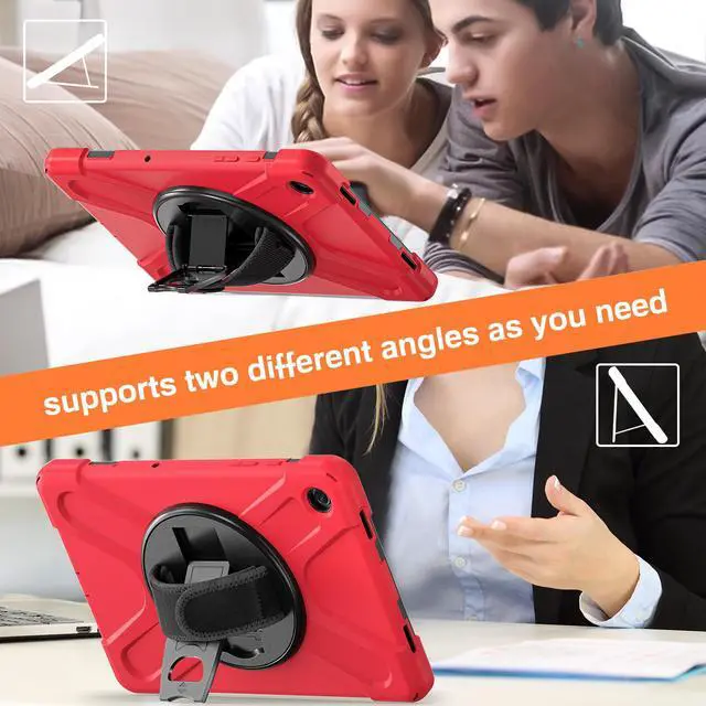 360 Degree Rotatable Kickstand & Hand Strap: 360 degree rotatable kickstand offers multiple angles for viewing, typing and reading. Ergonomic and adjustable back handle allows you to grip your tablet securely and steadily with one hand, worry-free from dropping it