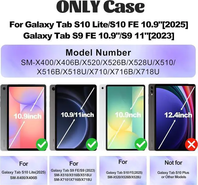 [Compatibility]: Exclusively designed for Samsung Galaxy Tab S10 Lite 5G 10.9 inch 2025 (Model SM-X400/X406B), Galaxy tab S10 FE 10.9 inch 2025 (Model: SM-X520/SM-X526B/SM-X528U), Galaxy Tab S9 FE 10.9 inch 2023 (SM-X510/ X516B/ X518U) & Galaxy Tab S9 11 inch 2023 (SM-X710/ X716B/ X718U). Please double confirm your tablet model before purchasing.