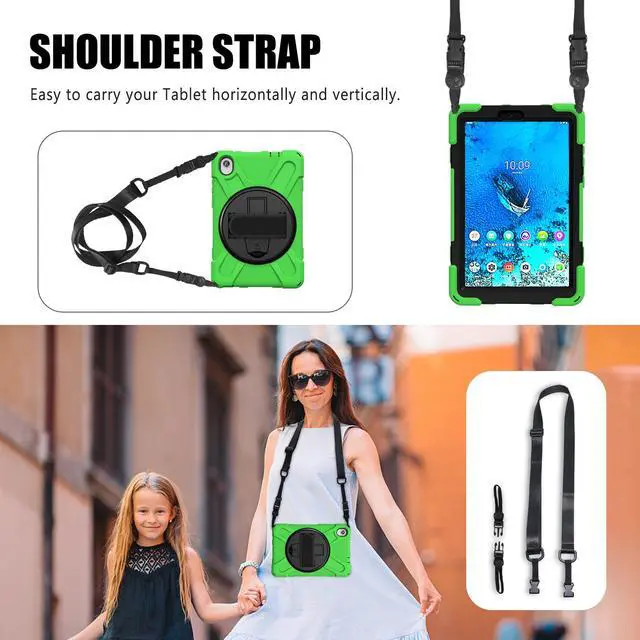 2-IN-1 HANDLE & STAND + REMOVABLE SHOULDER STRAP - 360 degree rotating waterproof material hand strap, helps for holding the tablet while on the movie. Handle folds into upright stand for watching movies or improved typing angle. Box includes expandable & detachable shoulder strap. Straps attach to holes forming carrying case like messenger bag / neck bag / sling / harness or cross body holster. You can even strap mount to car headrest for back seat entertainment