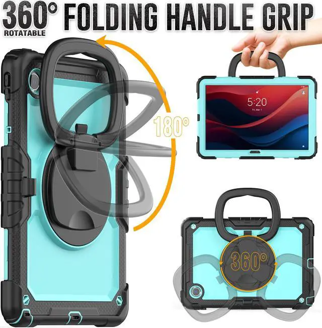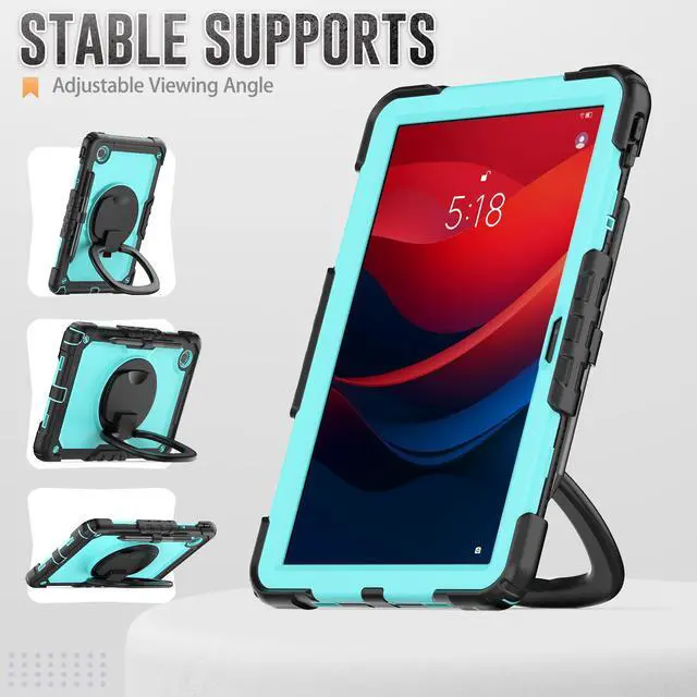 The back cover with built-ina folding kickstand is hidden inside. When the kickstand is extended, it can be rotated 360 degrees with the turntable to achieve different stand angles.You will have the stable angle for movie-viewing, typing, reading or face-to-face chattin.