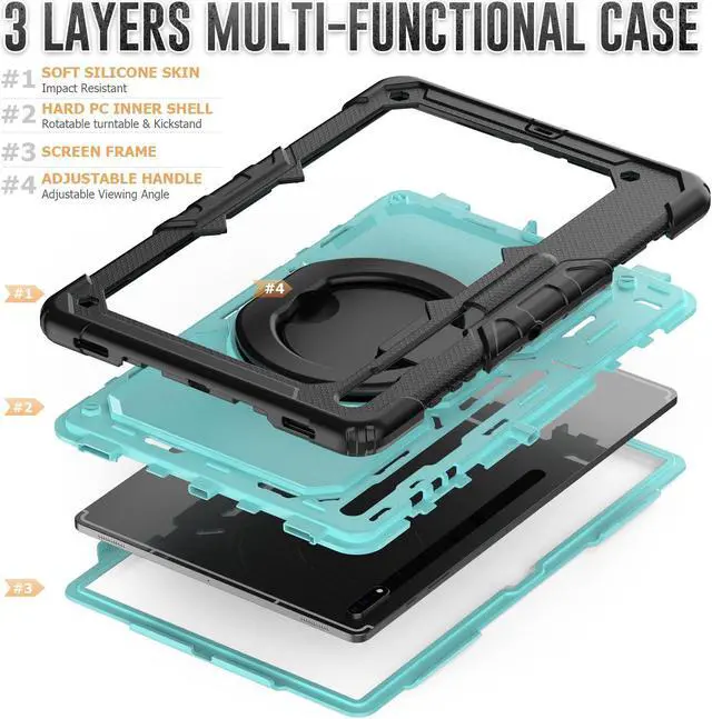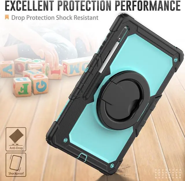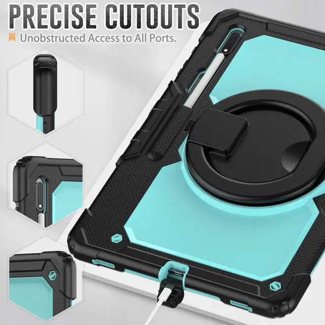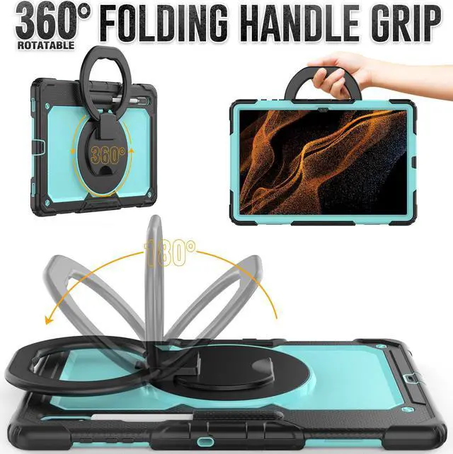 [360 Degree Rotating Kickstand & Hand Strap]: This shockproof case has a 360-degree turntable sturdy kickstand which can support your device from multiple perspectivesthe hand strap is also adjustable, securely and convenient using with one hand when in a meeting or classroom or outdoor activities.
