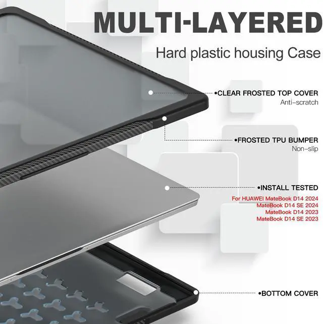 Compatibility : This Shockproof protective case ONLY fits for HUAWEI MateBook D14 2023 & for HUAWEI MateBook D14SE 2023 & for HUAWEI MateBook D14 2024 & for HUAWEI MateBook D14 SE 2024. NOT compatible with Matebook 14 or any other laptop models. Please kindly check the model number before your purchase.