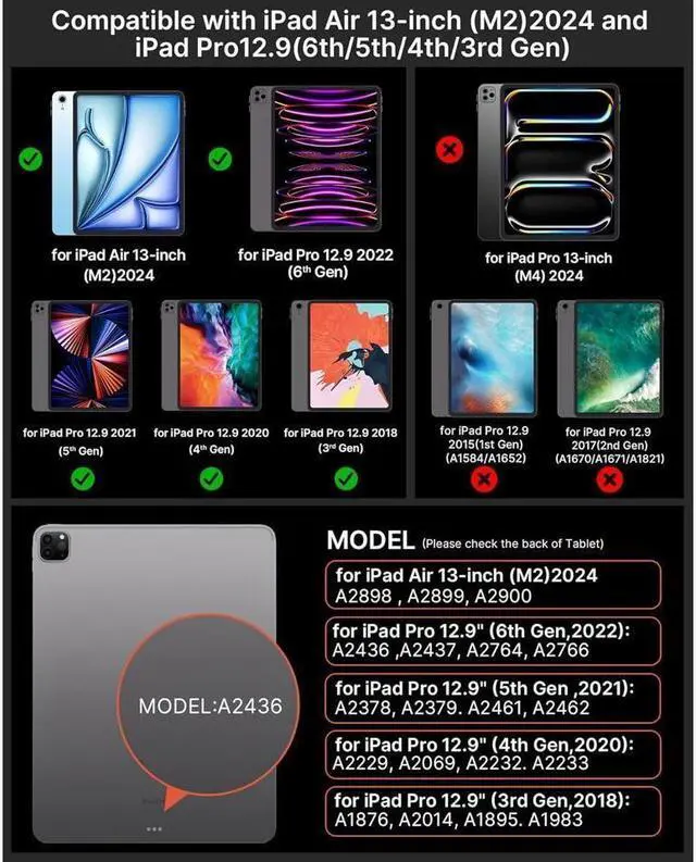 [COMPATIBILITY]Designed for New iPad Air 13 inch (M3) 2025 (Model: A3268/A3269/A3271), iPad Air 13-inch M2 2024 (Models: A2898/A2899/A2900), iPad Pro 12.9 inch 2022 6th Generation (Model: A2436, A2437, A2764, A2766), iPad Pro 12.9 inch 2021 5th Generation (Model:A2378, A2379, A2461, A2462), iPad Pro 12.9 inch 2020 4th Generation (Model:A2229, A2069, A2232, A2233), and iPad Pro 12.9 inch 2018 3rd Gen (Model:A1876, A2014, A1895, A1983).Not for other models,please check the ipad model before purchasing.