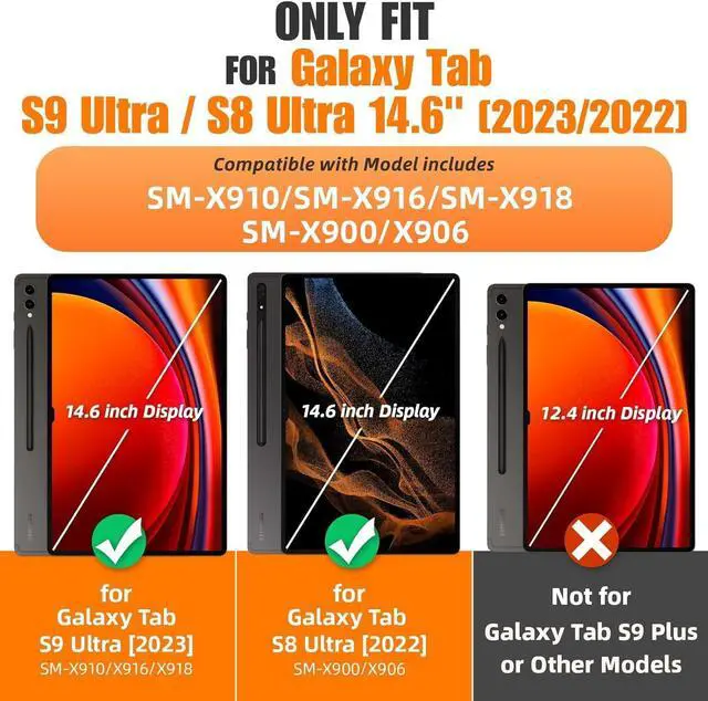• Perfect Compatibility: This case is compatible with Samsung Galaxy Tab Samsung Galaxy Tab S10 Ultra 14.6-inch 2024 Release (Model: SM-X920/X926B/X926N/X920N), Galaxy Tab S9 Ultra Inch 2023 Release (Model: SM-X910/SM-916B/SM-918U) and Galaxy Tab S8 Ultra Inch 2022 Release (Model: SM-X900/SM-X906). It will NOT work for any other model device