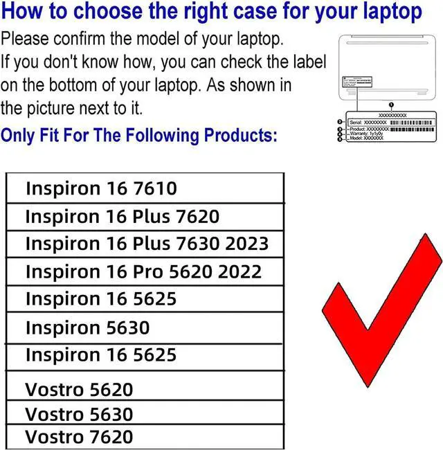 Compatible Model: This case only fits for Dell Inspiron 16 Plus 7640 7630 7620 7610, Inspiron 16 Pro 5620 5630 5625, Vostro 5630 5620 7620 16 inch, cover dimensions(W X D X H): 36.3*26.4*2.8cm, not any other laptop.