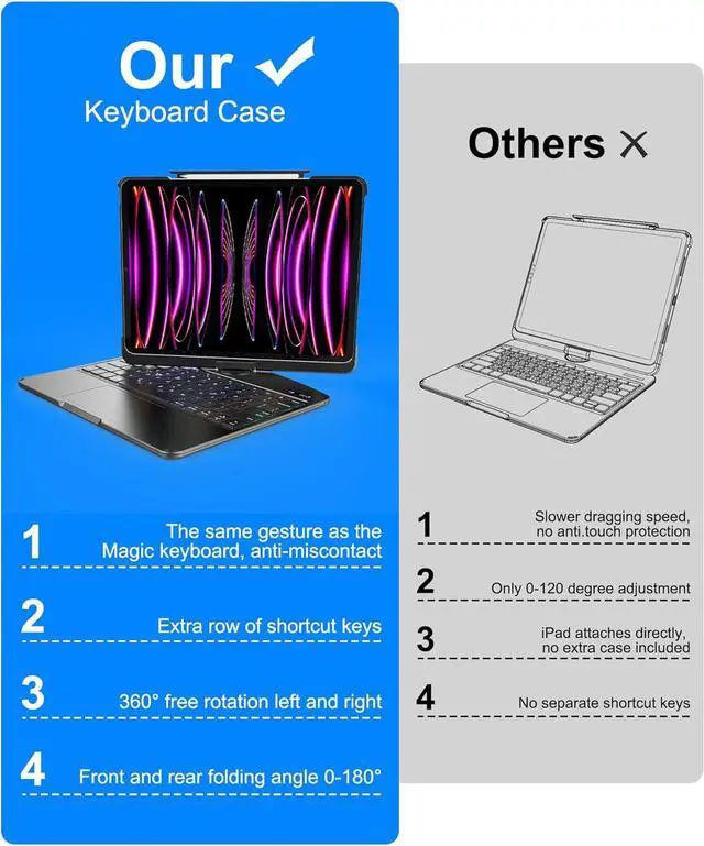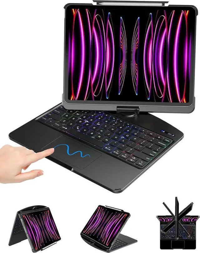 Smart Features and Rugged hard: The touchpad Keyboard Case can rotate by 360 degree , has laptop-like well-spaced keys, 7 Colors backlight keys, shortcut keys and a built-in trackpad. The power level is displayed as a percentage in the upper left corner.Premium hard-shell design protects all sides of your iPad and prevents being scratched from accidental dropping and bumps. Keyboard cover can be folded. When you do not use the keyboard, you can fold the keyboard to the back. Its automatic sleep function help to reduce power consumption and make the battery more durable