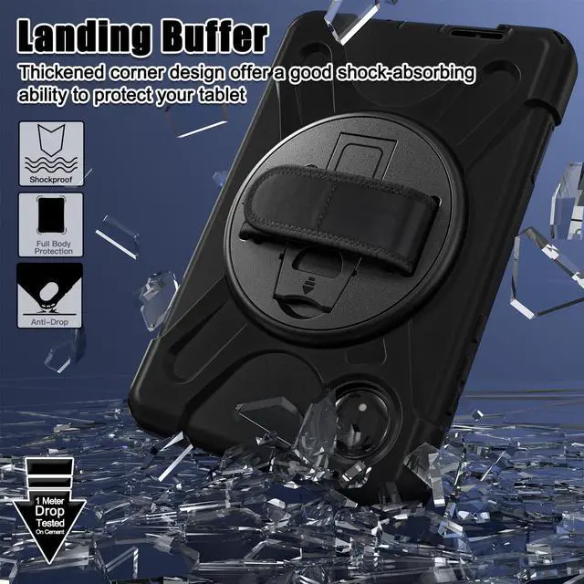 360° ROTATABLE STAND & HAND STRAP - 360° Rotatable foldable stand offers multiple angles for enjoying the most comfortable keyboard-typing, movie-viewing or draw. This sturdy kickstand can be folded when you don't need it. Ergonomically 360°Rotatable adjustable hand strap makes you hold or use your tablet easily in all directions, adjustable velcro hands strap allows big hand and small hand, perfect for kids and adults.