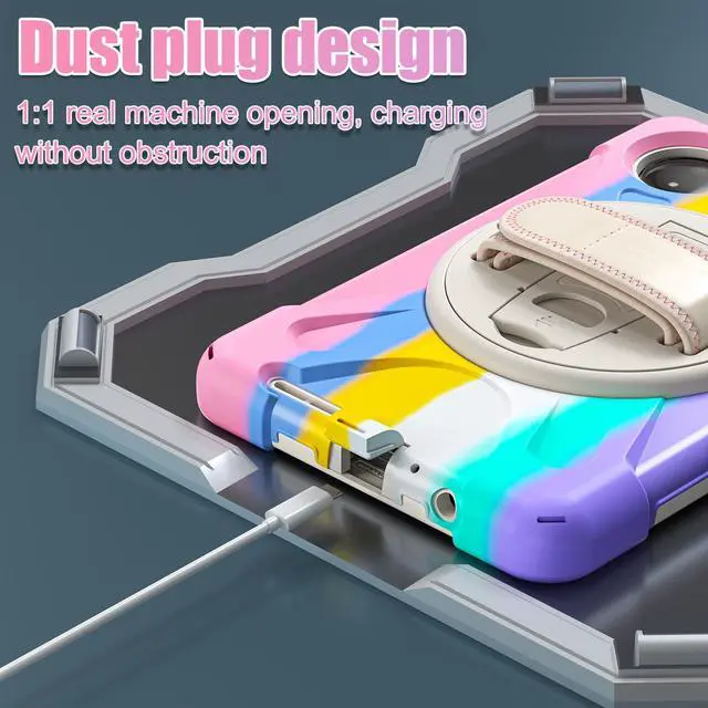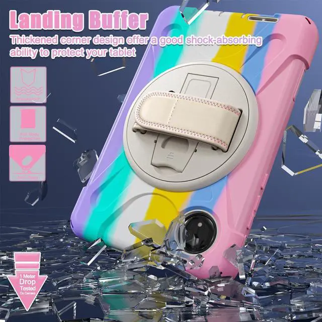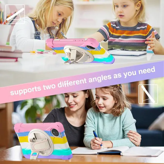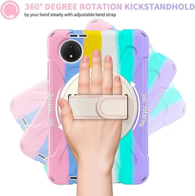 360° ROTATABLE STAND & HAND STRAP - 360° Rotatable foldable stand offers multiple angles for enjoying the most comfortable keyboard-typing, movie-viewing or draw. This sturdy kickstand can be folded when you don't need it. Ergonomically 360°Rotatable adjustable hand strap makes you hold or use your tablet easily in all directions, adjustable velcro hands strap allows big hand and small hand, perfect for kids and adults.