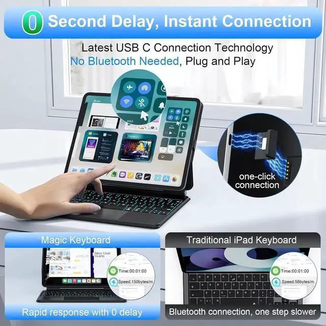 Auto-Connect Design --- After inserting the included PING adapter, simply align the back of your iPad with the contact points on the rear cover of the keyboard case and gently place your device, it will automatically connect to the keyboard instantly without the need for manual Bluetooth pairing. The fast and stable connection ensures that you can start using the iPad pro 11 M5 M4 keyboard case immediately with no additional steps, offering a smoother and more efficient experience.