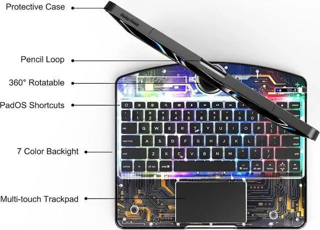 Smart Features and Rugged hard: The touchpad Keyboard Case can rotate by 360 degree , has laptop-like well-spaced keys, 7 Colors backlight keys, shortcut keys and a built-in trackpad. The power level is displayed as a percentage in the upper left corner.Premium hard-shell design protects all sides of your iPad and prevents being scratched from accidental dropping and bumps.