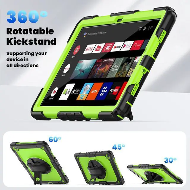 The back cover with built-ina folding kickstand is hidden inside. When the kickstand is extended, it can be rotated 360 degrees with the turntable to achieve different stand angles.You will have the stable angle for movie-viewing, typing, reading or face-to-face chattin.