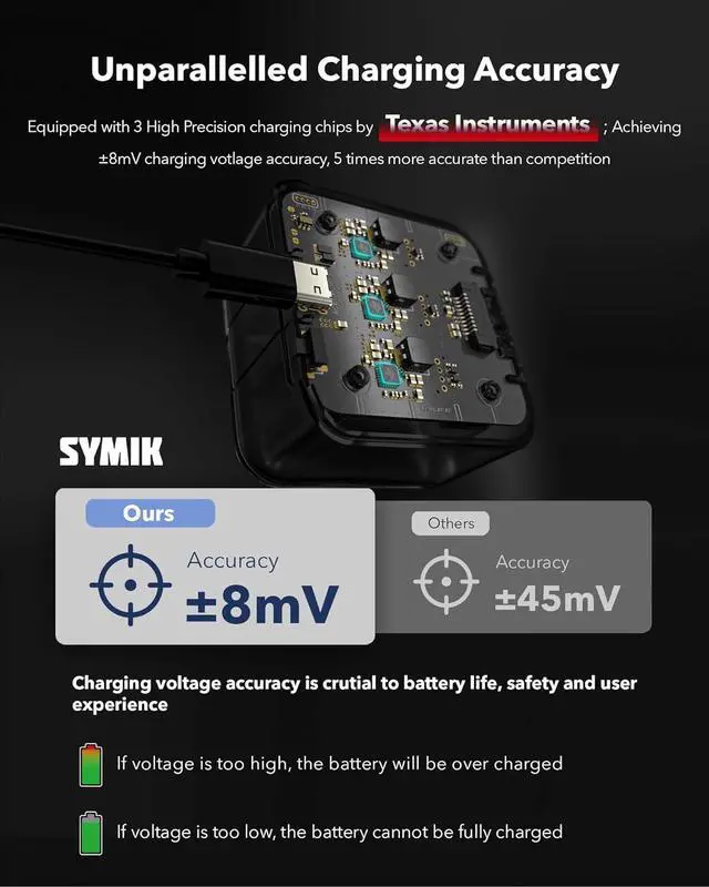 Unparalleled Charging Accuracy: Equipped with 3 highly accurate charging management chips from Texas Instruments which cost 5-10 times more compared to the ones others used. Each charger channel is individually tested and calibrated (if necessary) with +-8mV accuracy compared to +-45mV typical accuracy of others. Making sure your batteries are neither over charged nor under charged