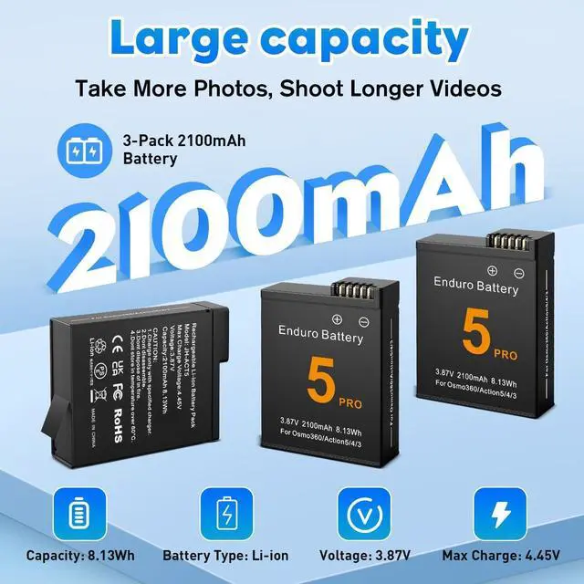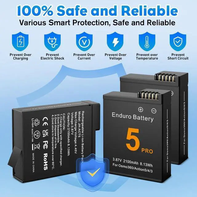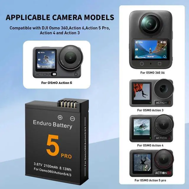 Product List:2 pcs Li-ion Batteries and 1 pc Battery Charger for DJI Osmo 360/Action 6/Action 5 Pro/Action 4/Action 3