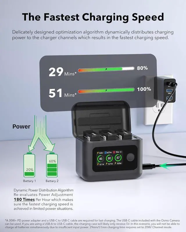 Max 20W Fastest Charging Speed: At 12W power each channel, charges 3 OSMO 360&Action 6&Action 5 Pro/4/3 batteries from 0% to 80% in 29 minutes, 0% to 100% in 51 minutes in room temperature,It takes more time to fully charge the second and third batteries