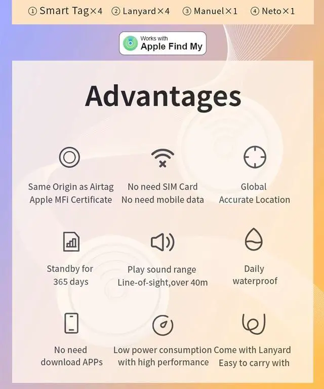 Long Service Replaceable Battery: an battery (CR2032) for every air tag is included (lasts up to 12 months). Even if it is left outdoors, it can keep working for a long time. The battery level will beverye displayed on the app. This tracker makes for an excellent gift for friends in need.