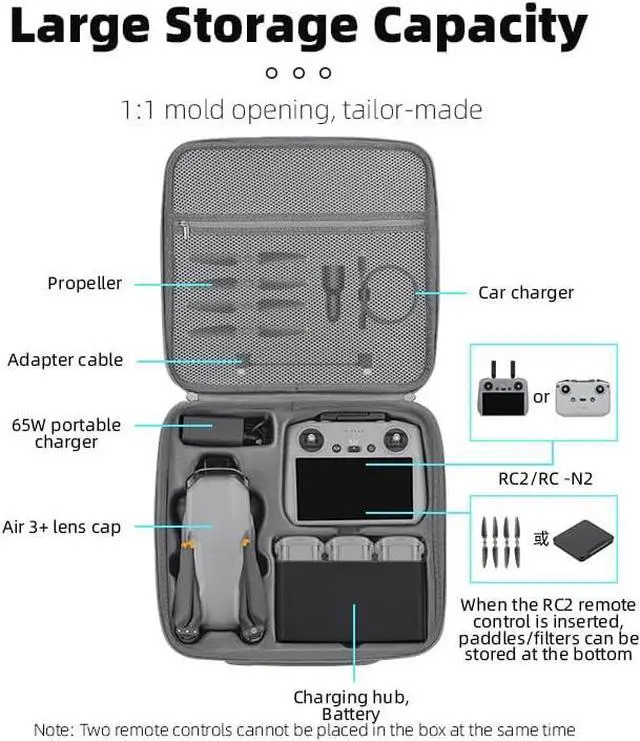 CUSTOM DESIGN: Storage bag with shoulder strap, designed for DJI Air 3 drone and DJI RC 2/RC-N2 controller and other drone accessories. Note: The RC-N2 remote control and the RC 2 remote control with screen cannot be placed in the case at the same time.