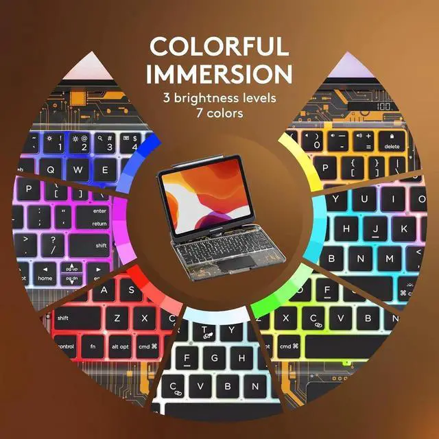 Smart Features and Rugged hard: The touchpad Keyboard Case can rotate by 360 degree , has laptop-like well-spaced keys, 7 Colors backlight keys, shortcut keys and a built-in trackpad. The power level is displayed as a percentage in the upper left corner.Premium hard-shell design protects all sides of your iPad and prevents being scratched from accidental dropping and bumps. Keyboard cover can be folded. When you do not use the keyboard, you can fold the keyboard to the back. Its automatic sleep function help to reduce power consumption and make the battery more durable