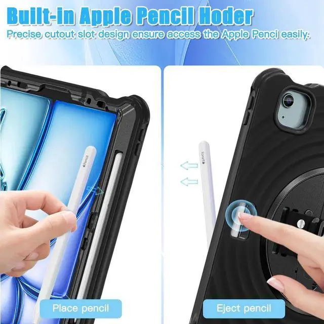 The 360° rotating hand strap offers secure handling and control, allowing one-handed use of your compatible iPad. The built-in pencil holder keeps your Apple Pencil secure and accessible for note-taking, drawing, or annotating.