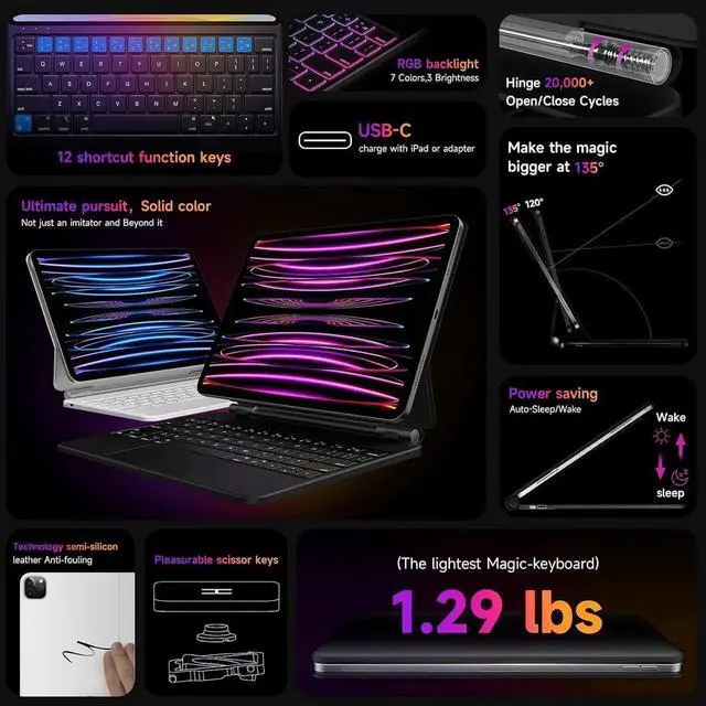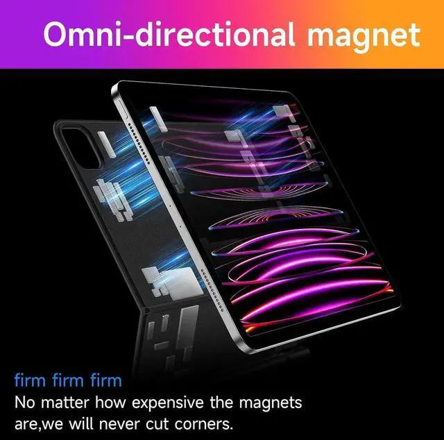 Floating Cantilever Stand --- Adopt magnetic suspension design,strong magnetic suction to ensure the safety of your iPad.Ergonomically floating cantilever stand[adjustable 135° angle],you can choose the most comfortable tilt angle to use your iPad.You can also wake up or sleep your iPad by opening or closing your keyboard case.
