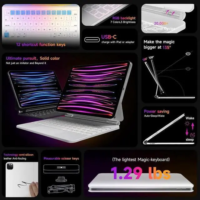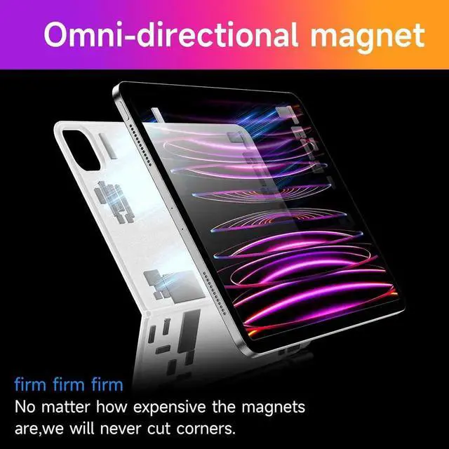 Floating Cantilever Stand --- Adopt magnetic suspension design,strong magnetic suction to ensure the safety of your iPad.Ergonomically floating cantilever stand[adjustable 135° angle],you can choose the most comfortable tilt angle to use your iPad.You can also wake up or sleep your iPad by opening or closing your keyboard case.