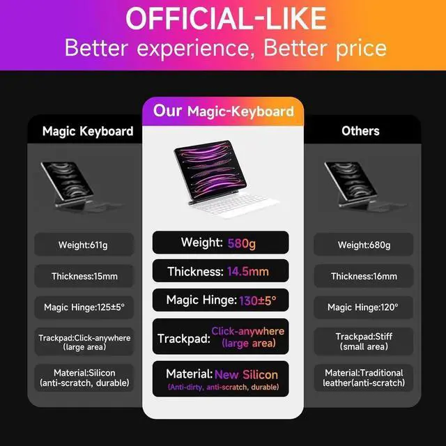 Ultra Slim Design --- 0.57" and 1.27 lbs,Extremely thin keyboard,as thick as a leather case,thinner and more beautiful than the official iPad magnetic keyboard.The keyboard case was feel like a natural extension of your iPad Pro with premium materials, clean lines, and beautiful aesthetics.