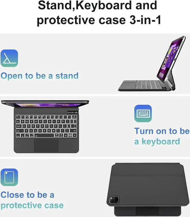 [Backlit Multi-touch Touchpad Design] - The built-in touchpad allows you to navigate and control the cursor like a laptop, no need have to touch the screen or additional mouse. It delivers a comfortable user experience while allowing you to tap, scroll, and swipe through content effortlessly.Adjusting backlight and 3 levels of brightness ensures clear visuals in every setting, enhancing your immersive experience.(Notice: Please Upgrade Your iPad Software to iPadOS13.4 and above to fully access to the Touchpad Function!)