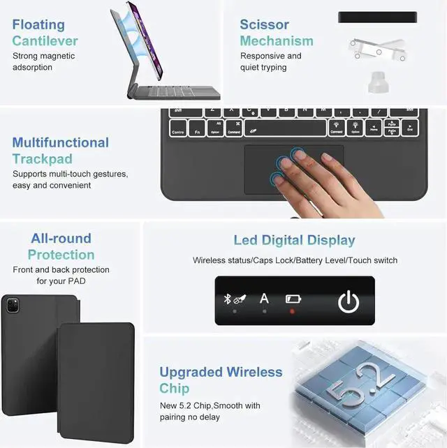 Protective Case: The iPad Magic keyboard is in high quality which can keep your iPad free from bumps, scratches, dirt, shocks and other daily damages.