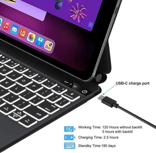 [Smart Features] - The vegan leather cover folding as a Protective shell to prevent bumps and scratches, ensures your iPad stays safe. Fluidly and accurately typing on illuminated keys of iPad Pro 11 keyboard, comfortably fit the shape of your fingertips.The floating cantilever design allows for effortless adjustment to your preferred viewing angle. Support Apple Pencil Wireless Charging.Power display screen can let you know the remaining power of your keyboard.