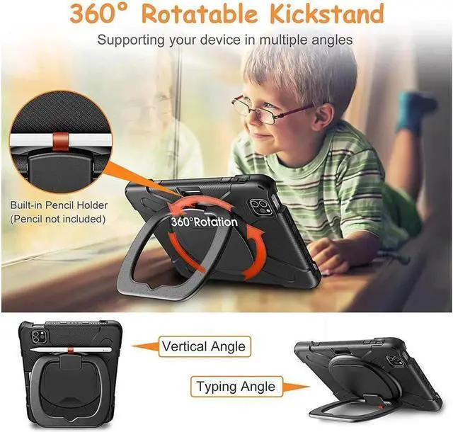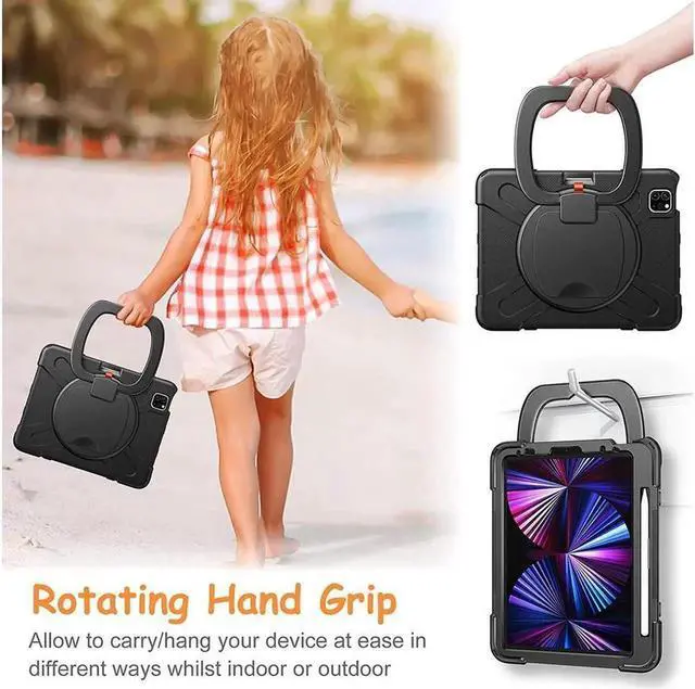 360° Rotating Multi-Functional Ring Grip 3-Layer Shockproof Kid Friendly Kickstand Cover with Built-in Stand & Shoulder Strap & Pencil Holder for iPad