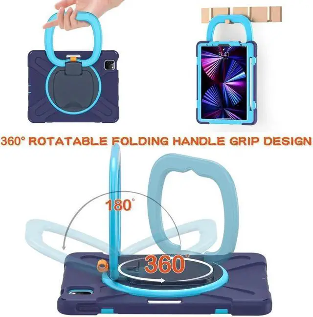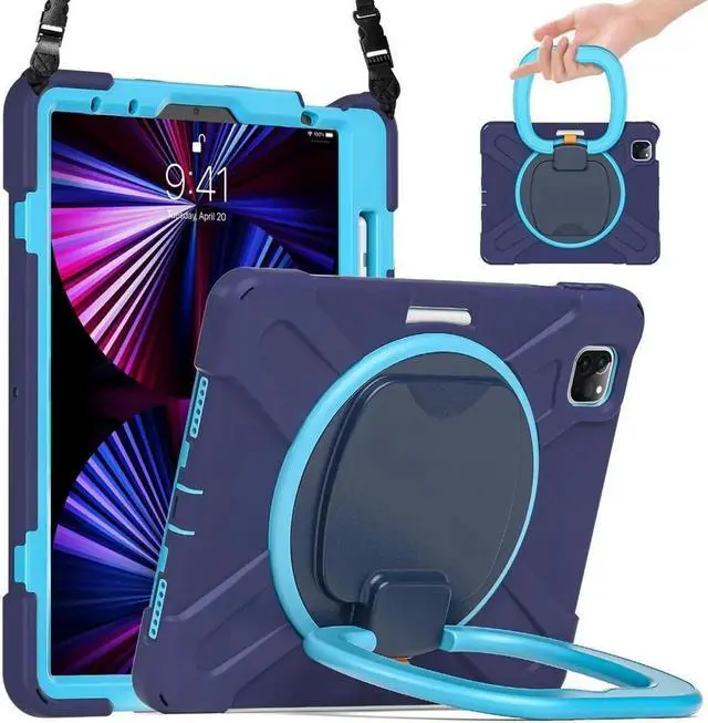 360° Rotating Multi-Functional Ring Grip 3-Layer Shockproof Kid Friendly Kickstand Cover with Built-in Stand & Shoulder Strap & Pencil Holder for iPad