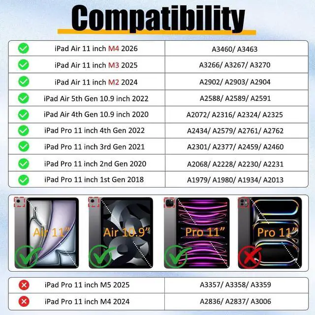Compatibility: Exclusively designed for for iPad Air 11 inch M4 2026 (A3460/A3463), iPad Air 11 inch M3 2025 (A3266/A3267/A3270),iPad Air 11 inch M2 2024 (A2902/A2903/A2904); 10.9 inch iPad Air 5th Gen 2022 (A2588/A2589/A2591), iPad Air 4th Gen 2020 (A2072/A2316/A2324/A2325), iPad Pro 11 inch 4th Gen 2022 (A2434/A2579/A2761/A2762), iPad Pro 11 inch 3rd Gen 2021 (A2301/A2377/A2459/A2460), iPad Pro 11 inch 2nd Gen 2020 (A2068/A2228/A2230/A2231), iPad Pro 11 inch 1st Gen 2018 (A1979/A1980/A1934/A2013). Not compatible with other iPad models. Apple Pencil & Screen Protector is not included!
