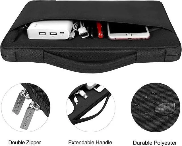 The 360 degree protective shockproof laptop sleeve with handle carrying bag internal dimension: 13.39 x 9.25 x 0.79 inches (L x W x H); external dimension: 13.98 x 9.84 x 0.79 inches (L x W x H). The front side pocket dimension: 11.61 x 9.25 inches (L x W). Made of polyester material, protect your laptop against accidental spills. Slim and lightweight, does not bulk your device up and can easily slide into your briefcase, backpack or other bag. Ideal for business, daily and travel