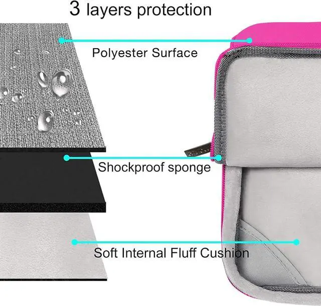 The 360 degree protective shockproof laptop sleeve with handle carrying bag internal dimension: 13.39 x 9.25 x 0.79 inches (L x W x H); external dimension: 13.98 x 9.84 x 0.79 inches (L x W x H). The front side pocket dimension: 11.61 x 9.25 inches (L x W). Made of polyester material, protect your laptop against accidental spills. Slim and lightweight, does not bulk your device up and can easily slide into your briefcase, backpack or other bag. Ideal for business, daily and travel