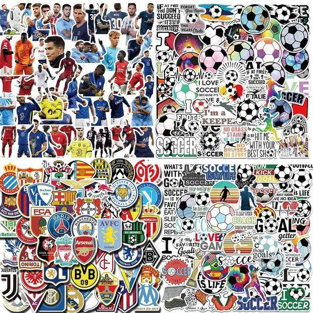 200 sheets of different styles of soccer stickers for hydroflasks, measuring 2.7 x 2.7 x 0.01 inches, including sports slogans, sports scenes, and more, in a variety of colors and beautiful patterns.