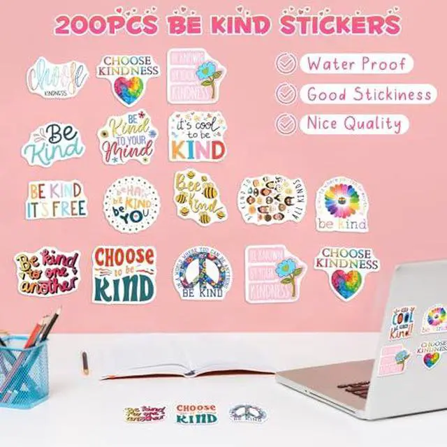 200Pcs Be Kind Stickers, Kindness Waterproof Motivational Letter Quotes Stickers, School Encouragement Inspirational Water Bottle Decals Bee Kind Gift for Water Bottles Scrapbook Teachers