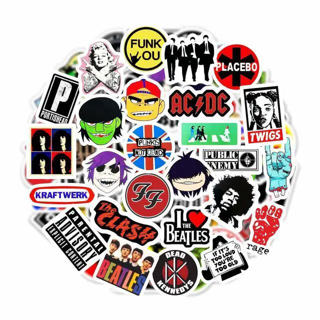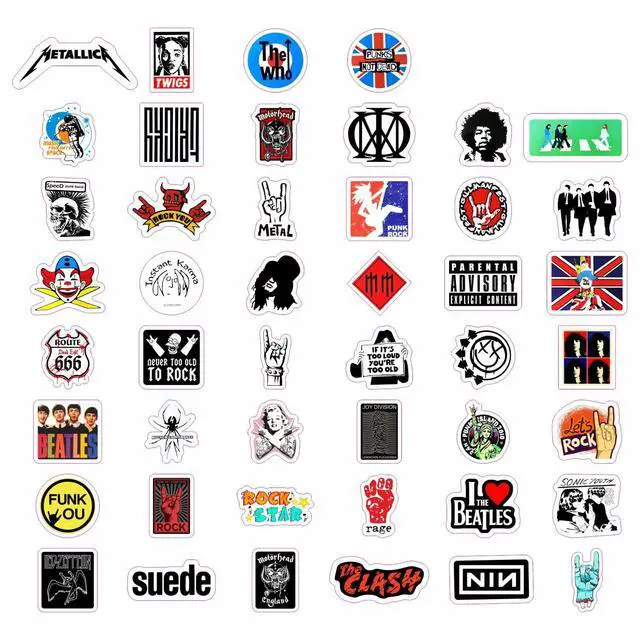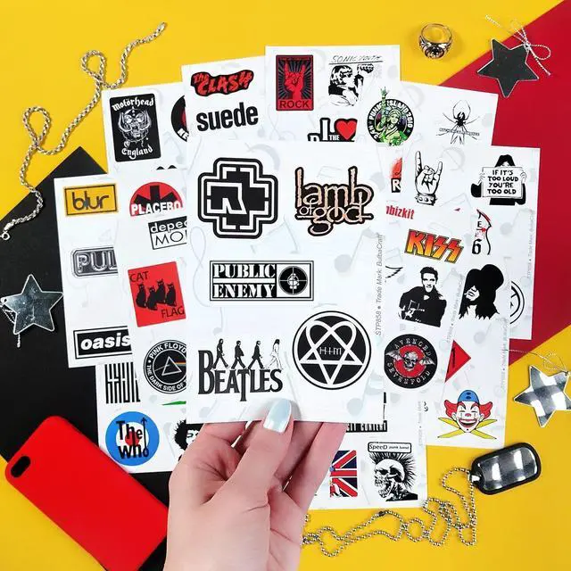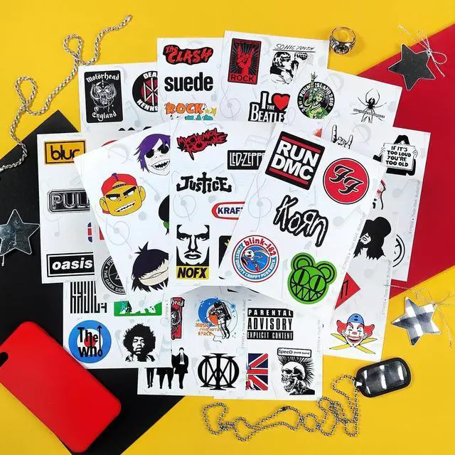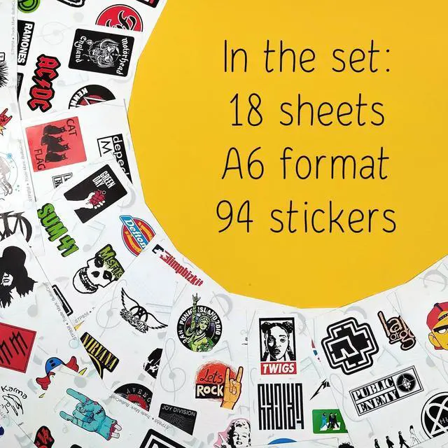 UNIVERSAL This sticker pack is suitable for teenagers and adults. If you are a fan of rock music, this sticker pack is definitely for you. You will find various letterings of your favorite rock bands and singers. Use these vinyl band stickers to liven up any smooth surfaces: phone, book, mirror, fridge, laptop, guitar, skateboard, bike, or snowboard.