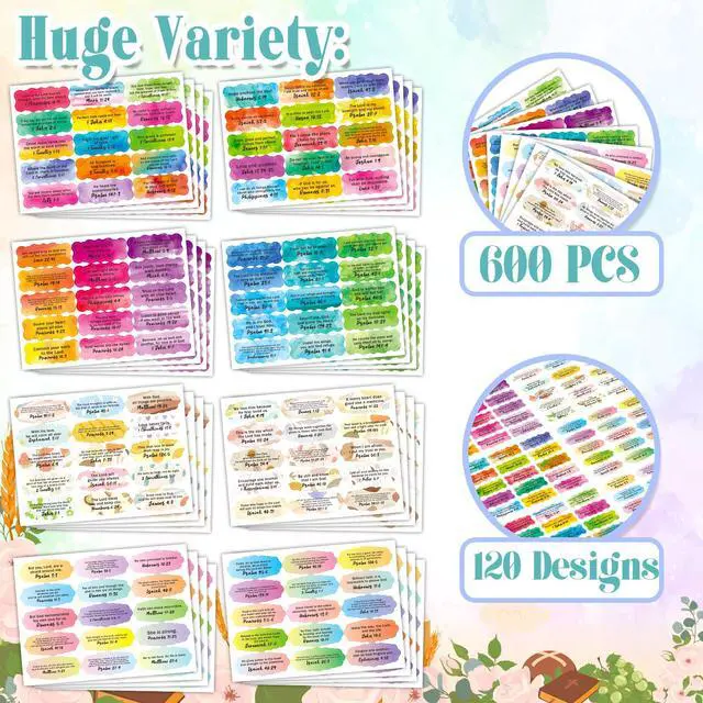 Variety Pack: Includes 600 inspirational Bible verse stickers (40 sheets) in 120 unique designs, each sized 10 x 6 x 0.5 inches. Perfect for sharing with loved ones, these scripture stickers feature uplifting Bible verses to add positivity and brighten your day.