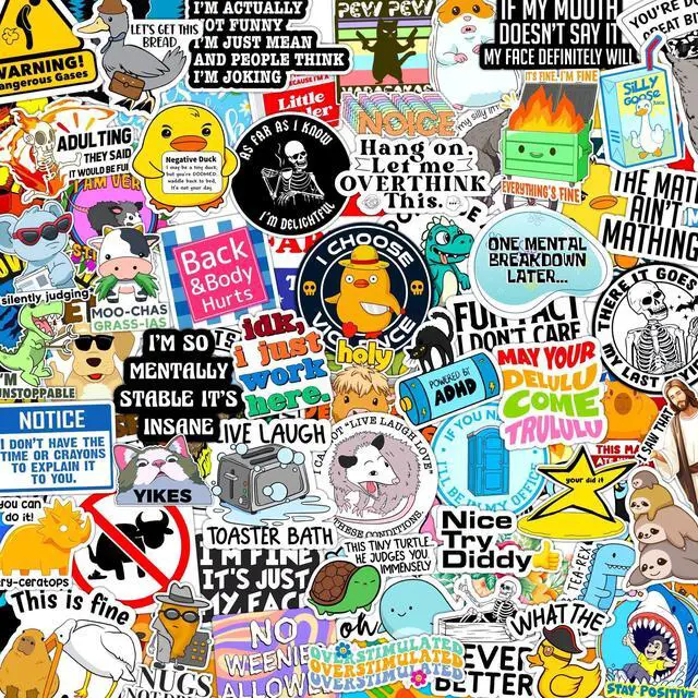 Funny Stickers for Adults. Vibrant Sticker Collection: This set features an eclectic mix of bold, humorous, and eye-catching stickers with various designs, characters, and phrases.