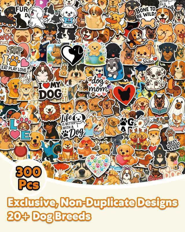 300 Unique Dog Stickers: Includes 300 non-repeating designs featuring 20+ popular dog breeds like Frenchie, Lab, Golden, GSD, Poodle, and more.