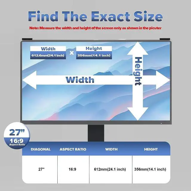Perfect for 27 Inch Monitor: The computer privacy screen filter perfectly fits for 27 inch widescreen monitor with an aspect ratio of 16:9. To determine the right size of your screen, measure the height and width of your screen without the boarder. If you have any problems with the size, please contact us directly.