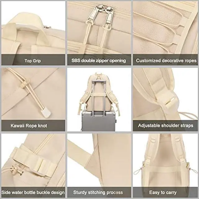 Large capacity school bag possesses a primary pocket with computer compartment, zippered mesh pocket, a broad primary compartment, a second main compartment with open storage pockets, a bank card (card slot), and a small zippered mesh pocket. exterior structure: The pockets on both sides are hung with custom-made cords, The front of the backpack has a mesh zippered pocket with handmade kawaii custom cords dangling from it, and a zippered side storage pocket, sufficient for everyday needs.