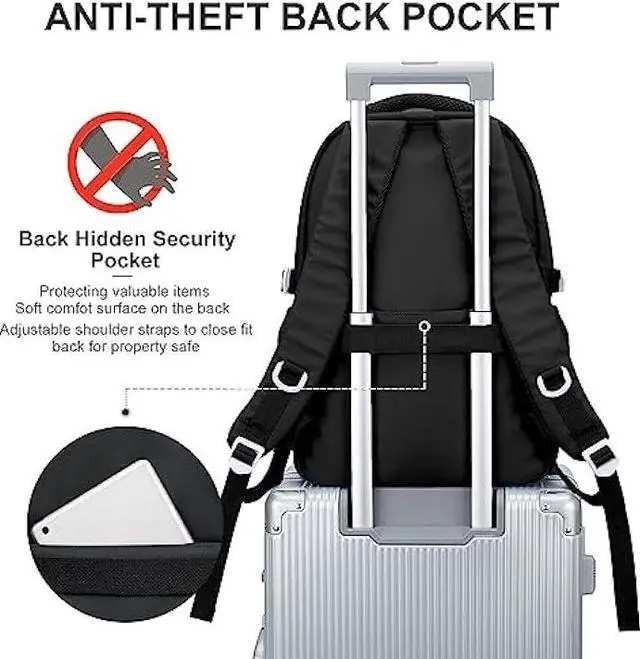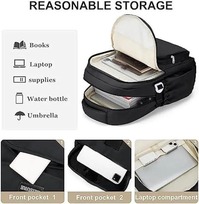 Large Capacity & Multiple CompartmentsThe women's travel backpack features 4 pockets of different sizes and two elastic side pockets. The main compartment includes a padded laptop sleeve and two pockets, which can hold many books or clothing for a 2-day trip. The large front pocket and front adhesive pocket can accommodate tablets and books, while the zippered pocket on the front can hold daily essentials for easy access. Additionally, there is an anti-theft zippered pocket on the back.