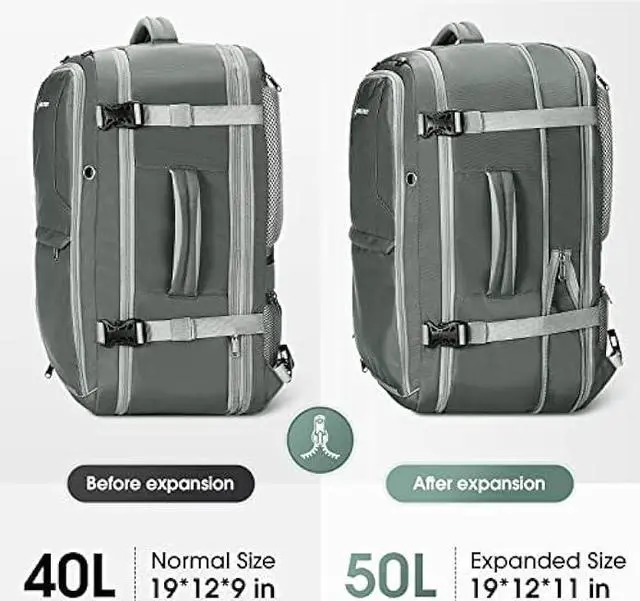 Expandable Large capacity design: laptop backpack standard size 19*12*9in inches (40L); expandable size 19*12*11in inches (50L). Travel bag has 3 large compartments, 2 laptop compartments (one for a 13-inch tablet and one for a 17-inch laptop respectively) and 13 storage pockets, ideal for 3-7 days of daily travel