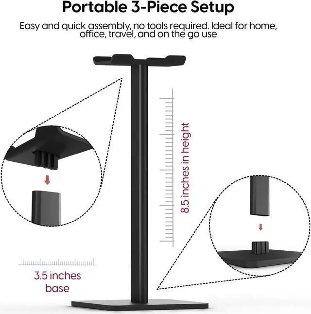 PORTABLE: Sturdy yet lightweight, our headphone hanger is easy to assemble and disassemble - no tools necessary and no hardware needed! Simply slip the headrest to the support bar and attach the support bar to the base.