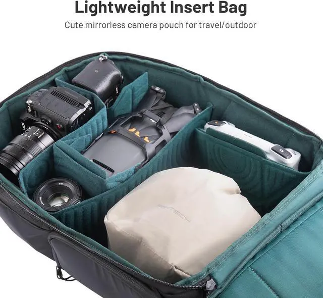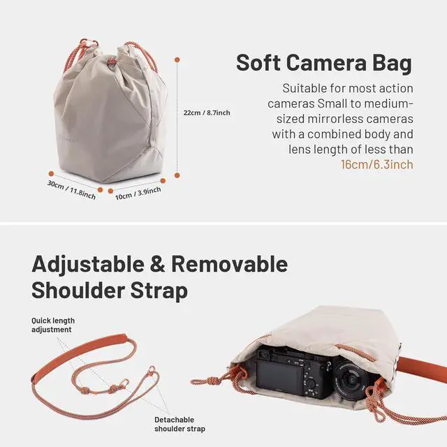 Compatibility: 8.7 in x 11.8 in x 3.9 in, the Camera Pouch can hold small or medium-sized mirrorless cameras with a combined body and lens length of less than 6.3 in, compatible with XT5/ R50/ Nikon ZF/Sony A7/Ricoh GR III; suitable for action cameras (OSMO Action/Pocket/Insta360/Gopro, etc. )